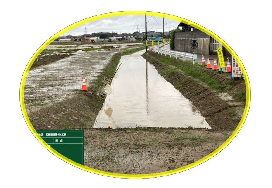 例えば、⽥んぼの中が冠⽔して、ブルドーザやバックホウ等の動きが悪くなりますし、場合によっては作業の中⽌を考えたりしなければなりません。