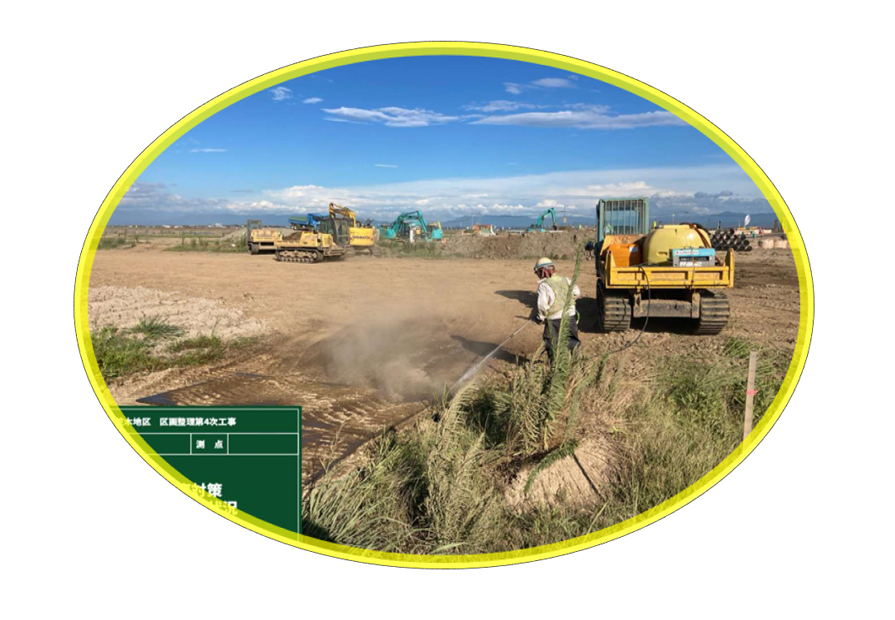 それは、どんな時かと⾔うと、夏のかんかん照りが続いたときであり、⽥んぼの中でバックホウ、クローラーダンプ等の重機が動く際、⽥⾯が乾燥し、⼟煙、砂埃が舞うからです。